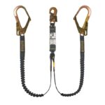 Amortiguador de impacto/Shock Absorbing alojado dentro de una cubierta de material sintético con propiedad termo-contraíble y transparente para su fácil inspección, con mosquetón (simple) doble cierre de seguridad en un extremo y, Cabo de vida doble (estrobo en Y) integrado en cinta tubular elasticada con ganchos estructureros en sus extremos restantes.