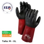 Guante con tejido interno de Nylon sin costuras, con recubrimiento Bi-Polymer (PVC+Nitrilo), es de color negro y burdeo y con acabado rugoso en la mano.